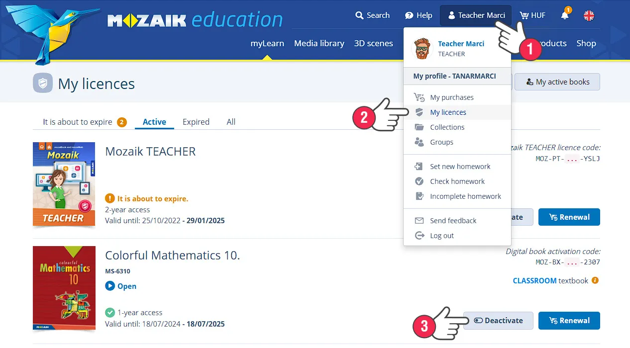 链接到用户帐户的许可证可以在激活后一周内停用。这些许可证是Mozaik TEACHER / Mozaik STUDENT以及数字图书和数字地图集的许可证。