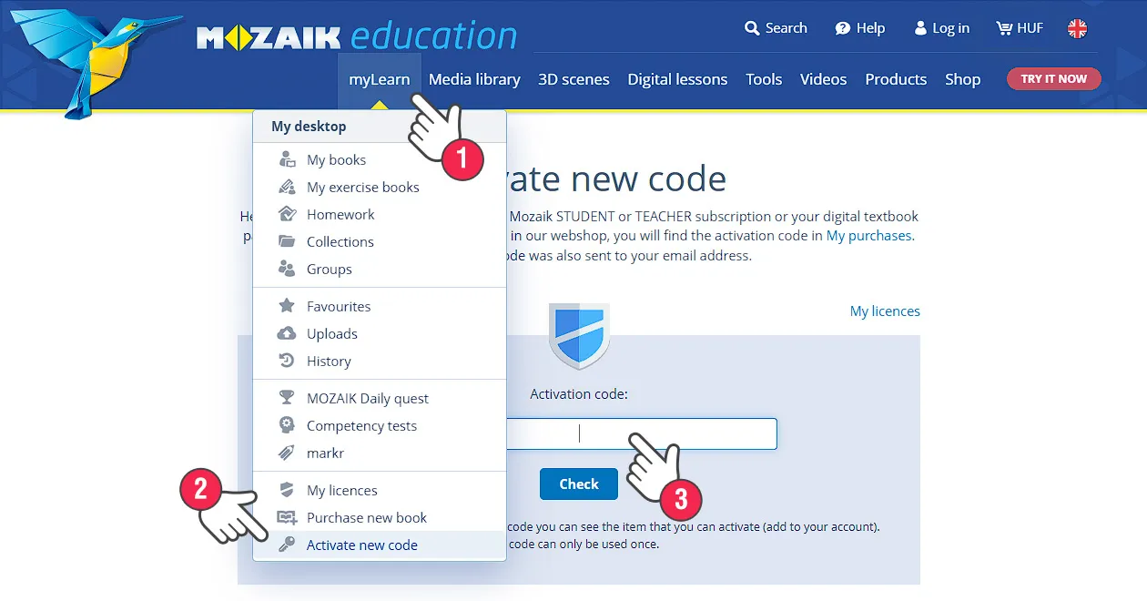 아직 안 하셨다면 우선 Mozaik Teacher / Mozaik Student 라이선스를 활성화시킬 수 있습니다.. mozaweb.com 웹사이트로 자기 계정을 통해 로그인하십시오. 제 계정 => 새 코드 활성화 메뉴 (또한 링크)를 클릭하시고 Mozaik Teacher / Mozaik Student의 활성화코드를 입력하십시오.t: