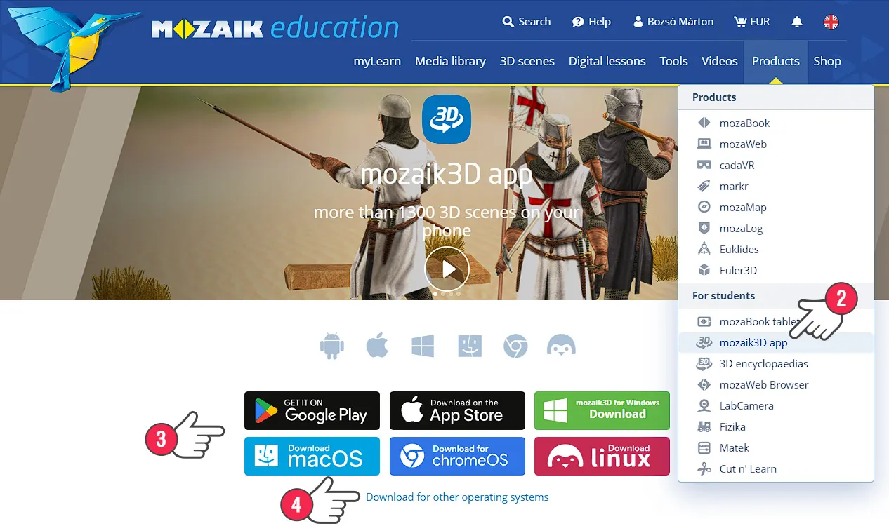 如果没有显示此消息,您可以通过点击产品 => mozaik 3D应用(2)菜单项来下载适用于您的系统的安装程序(3)。除了最常用的平台外,您还可以下载适用于其他操作系统的安装程序,例如适用于安卓互动白板的版本(4)。