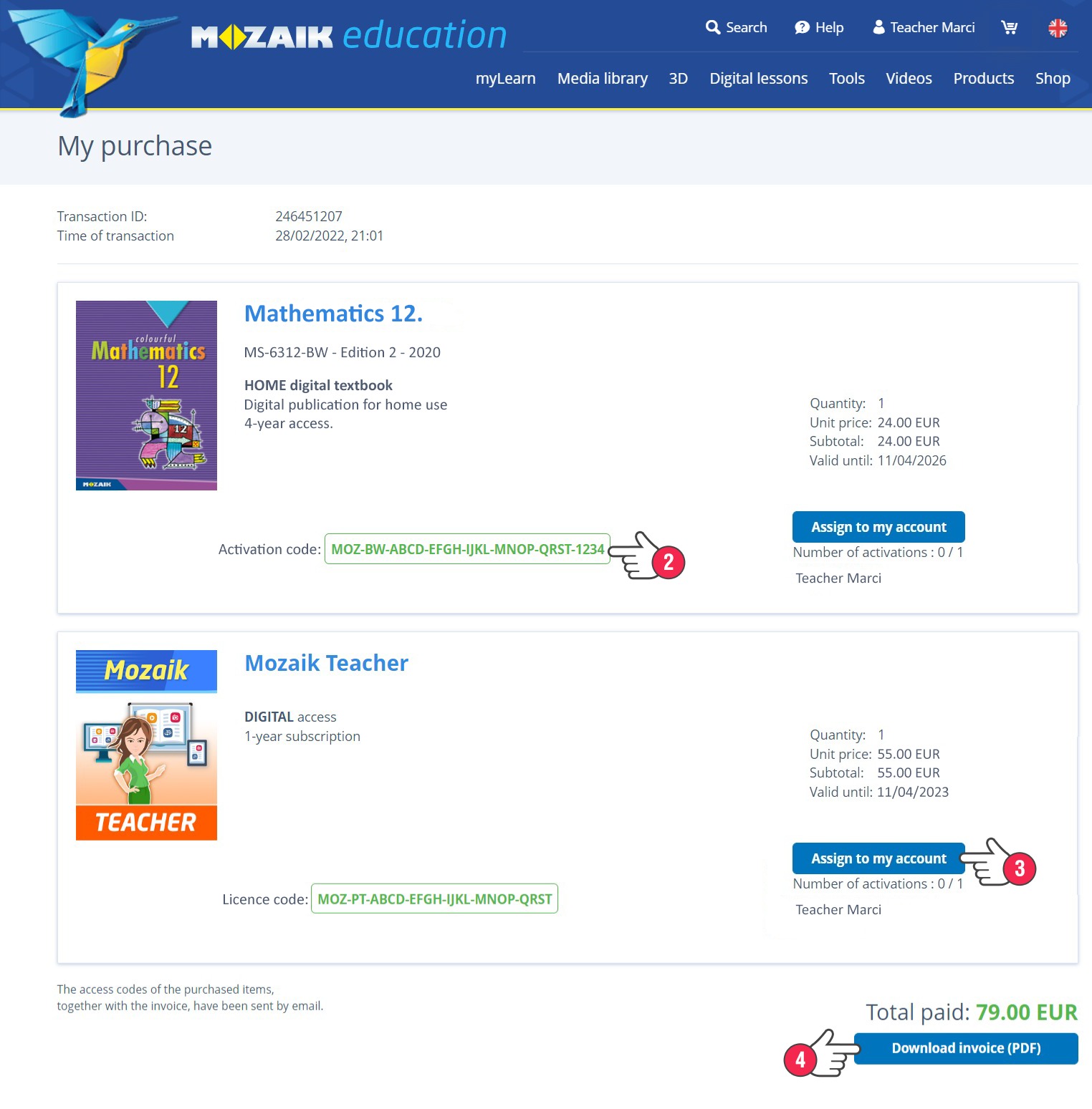 이 페이지에서는 구입하신 제품의 활성화 코드나 라이선스 코드도 보입니다. (2) 디지털 교과서과 mozaWeb PREMIUM 구독은 이 페이지에서 한 클릭으로만 바로 활성화 시키실 수 있겠습니다. 즉, 자신의 계정에 연결되어 있게 하시겠습니다. (3) 구입하신 상품에 대한 청구서를 다운로드하기가 가능합니다 (4).