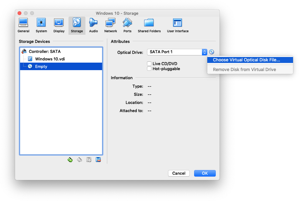 만들기 성공했다면 구성 버튼을 눌러서 가상 기계의 설정을 볼 수 있겠습니다. 여기 저장 메뉴에서 비어 있는 시디 드라이브를 고르고 나서 오른쪽에 있는 시디 아이콘을 눌러서 이전에 Microsoft 웹사이트에서 다운받은 Windows 10 설치 시디를 시작해야 합니다.