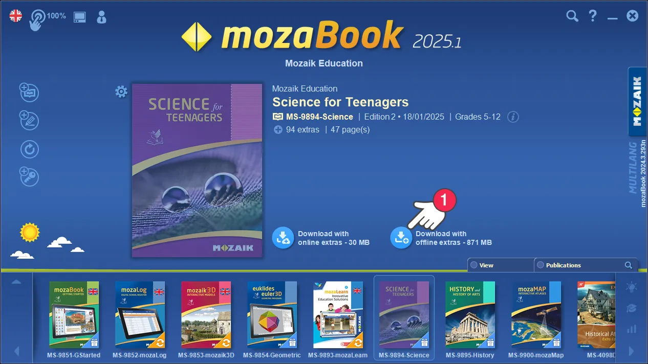 mozaBook では、書籍をオンライン形式でもオフライン形式でもダウンロードできます (1)。オフライン版はハードディスク上により多くの空き容量を必要としますが、一度ダウンロードすれば、インターネット接続がない状態でも書籍を開くことができ、書籍内のインタラクティブなコンテンツ(3D アニメーション、ビデオ、課題など)も使用可能です。