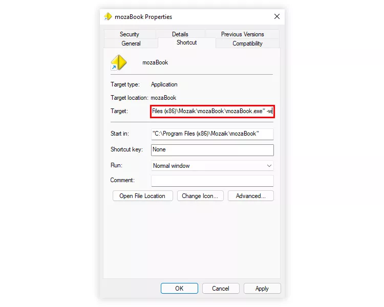 プロパティウィンドウでターゲット ラインを探し、 通常は、"C:\Program Files (x86)\Mozaik\mozaBook\mozaBook.exe"に含まれています。 行の終わりにスペースを追加し、次に "-w"を書き込んでください。.