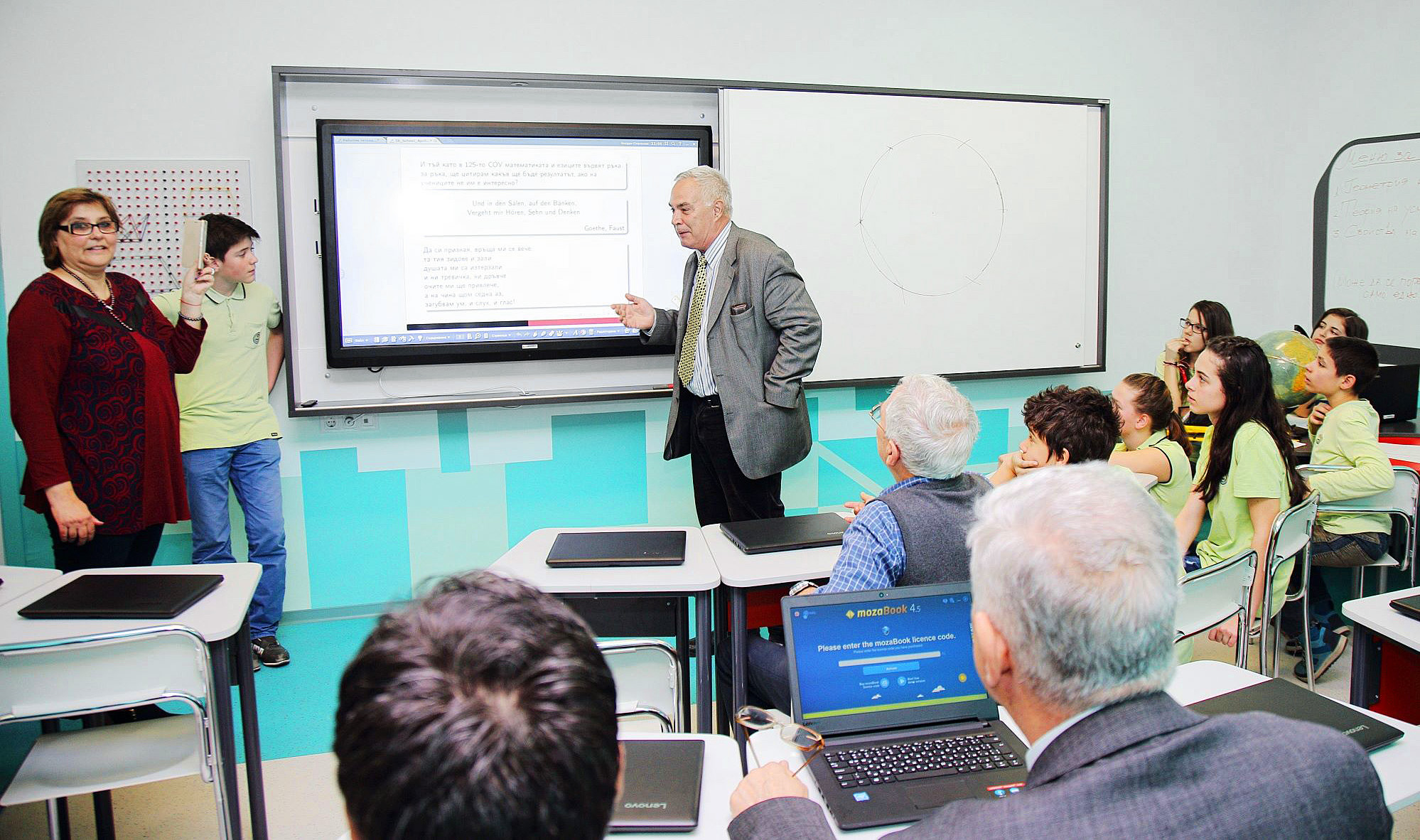 This April, a new Mathematical Laboratory at №125 secondary school in Sofia opened the doors to students allowing them to use the latest computer technologies. The institution is currently one of the best in the country, always striving to fortify its positions by drawing attention to the recent trends in education technology. We are extremely proud to have assisted them in such a complicated mission. During a demo lesson, students showed their best solving numerous logical tasks and drawing geometrical figures on the interactive board with the mozaBook software. The interactive board provides a unique opportunity to present educational content, grabbing the attention of students by turning all given information into an intriguing journey.