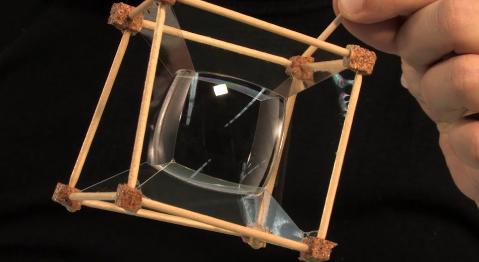 Opalizujące błony mydła rozciągające się w różnych kadrach.
