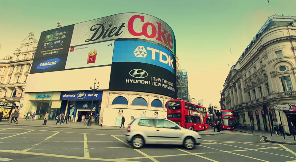 Londyński Piccadilly Circus jest szczególnie znany z ogromnych ekranów LED-owych i billboardów umieszczonych na ścianie budynku na rogu północnej części placu.