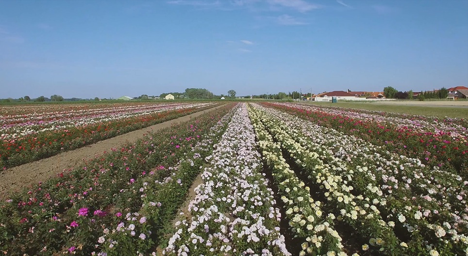 Film prezentuje uprawę krzewów różanych na skalę przemysłową.