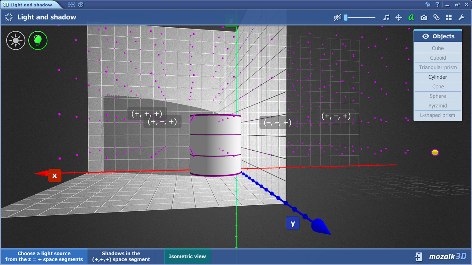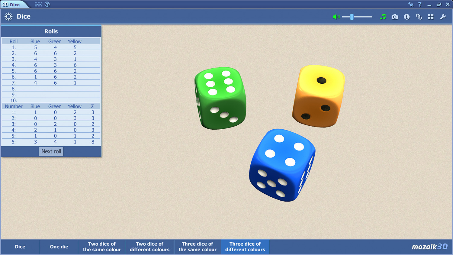 In another model, Light and shadow (below), the user can experiment by placing a light source near different spatial shapes in a room which is actually a 3D coordinate system. Depending on the type of light source, its placement and its distance from the shape, the shadow cast will differ dramatically. There are 8 different objects and two types of light to choose from in the coordinate system and the ability to rotate the 3D model and view the objects and shadows from different perspectives provides a great demonstration for students of art and physics alike.For statistics and probability (besides the best tool in the world (probably!)), our Dice 3D model (below) offers great support. Here the user can roll with different numbers and colors of dice and, as they roll they receive a statistical chart summing up the results, showing us the essence of the rules of chance.With our inbuilt exercises, our developers are doing their best to make sure that teachers receive sufficient help in explaining all topics for students with interactive digital tools. Register on mozaWeb to try out our 3D models for free, including the human skeleton!